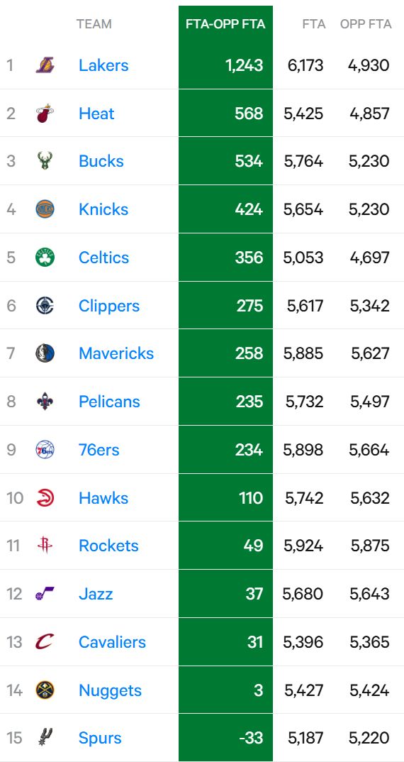 根据Statemuse的数据显示,自2022-23赛季以来,也就是最近的4个赛季,湖人的罚球净胜数是+1243次,断档领跑全联盟。排名第二的是热火,不过只有+568次,不及湖人的一半。雄鹿、尼克斯和凯尔特人分列第三到第五位。